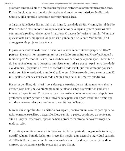 Por esses detalhes, Marchesini considera que esse tipo de passeio tem potencial para crescer, caso haja um levantamento mais detalhado sobre os cemitérios santistas e interesse da prefeitura. O pacote nasceu há aproximadamente nove anos, depois de o gestor receber um pedido de uma universidade paulistana para levar uma turma que estudava arte tumular para conhecer os cemitérios de Santos.
