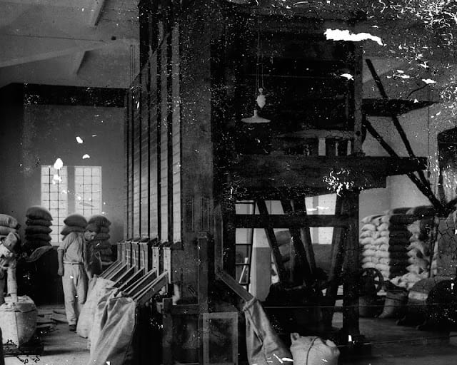 Armazém com máquina de beneficiamento de café, década de 1930. Fotografia e Fundo de Theodor Priesing. Acervo Museu do Café.