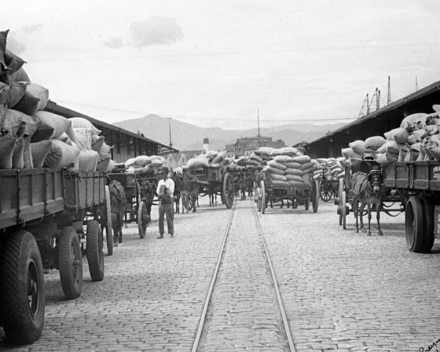 Carregamentos de café em carroças puxadas a burros no Porto de Santos. Fotografia e Fundo de Theodor Priesing. Acervo Museu do Café.