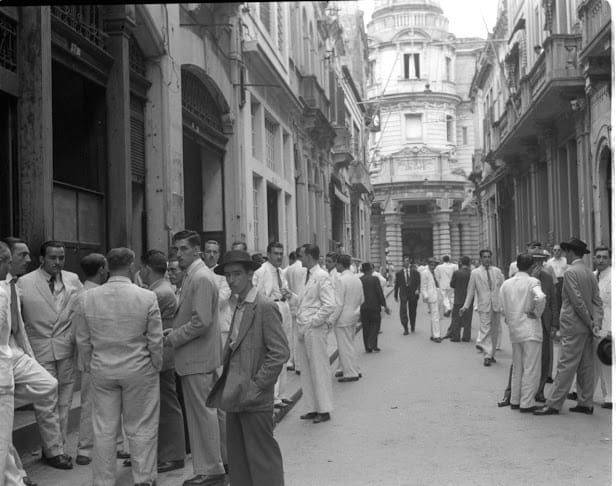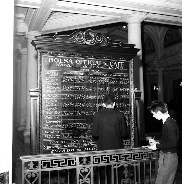 Entrada da Bolsa Oficial de Café com quadro de cotações diárias, em 1957. Fotografia e Fundo de José Dias Herrera. Acervo Museu do Café.