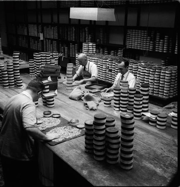 Sala de classificação de café, possivelmente no prédio da Bolsa Oficial, década de 1950. Fotografia e Fundo de José Dias Herrera. Acervo Museu do Café.