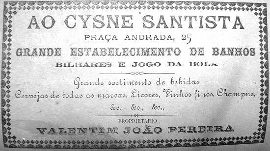 Tinham bom movimento as casas de banhos. Santos teve duas casas de banhos, a primeira das quais, por volta de 1870, na Praça dos Andradas nº 25, denominada Ao Cisne Santista, de propriedade de J.J. Marty.