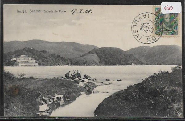Cartão Postal Antigo Santos SP: Ponta da Praia (17-02-1908), ao fundo Fortaleza Santo Amaro da Barra Grande.