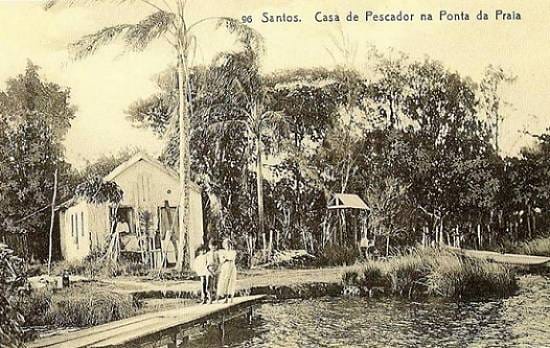 Foto Antiga Santos SP: Moradia de Pescadores Caiçaras na Ponta da Praia, em cartão postal circulado por volta de 1905.