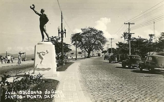 Inspirada em modelos gregos e romanos, a estátua Náutico Santista que aparece neste cartão postal original, do final dos anos de 1940, foi inaugurada a 1º. de setembro de 1946 por ocasião da entrega das obras de reurbanização das avenidas da orla, na Ponta da Praia, pelo então prefeito Antonio Gomide Ribeiro dos Santos. A estátua é uma homenagem aos esportistas náuticos e tem em seus lados desenhos de modalidades como natação, salto, remo e polo aquático. Em 1955, em pesquisa realizada pelos jornais O Globo e A Tribuna e pela rádio Globo do Rio, Santos foi eleita a cidade mais esportista do Brasil. O monumento é obra do artista Caetano Fraccaroli. Esse monumento foi construído de forma a ficar o braço direito que está segurando a coroa de louros, símbolo de glória, voltado para o mar, e o braço esquerdo, segurando a Águia, símbolo da vitória, voltado para a terra. A frente ficará voltada para os clubes de regatas. No pedestal estarão simbolizadas todas as modalidades desportivas, praticadas no mar e piscina. Tem a altura total de 5 metros, sendo de 2,50 aproximadamente, a altura do atleta”.