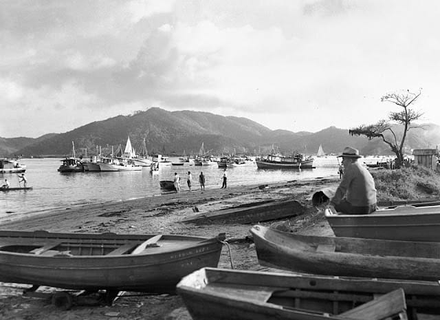 Foto Antiga Santos SP: Ponta da Praia (década de 1950), ainda com características visuais caiçaras, com vários barcos de madeira à beira mar, quando o local ainda abrigava moradias de pescadores e algumas chácaras. Foto de Boris Kauffmann.