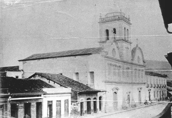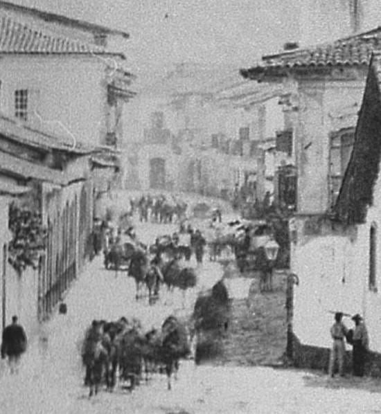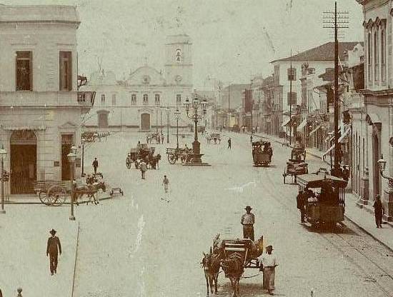 Detalhe da foto acima, mostrando os bondes com tração animal e mais detalhes da Matriz (que seria demolida até 1908):