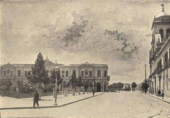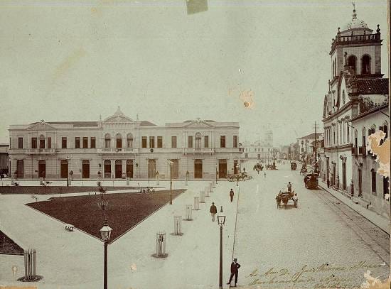 “Praça da República” (na verdade, vista ao fundo. Em primeiro plano está a Praça Barão do Rio Branco, tendo à direita a igreja e o convento do Carmo, e à esquerda o edifício que em 1924 seria ocupado pelo Santos Hotel). Foto publicada na revista paulistana A Lua nº 8, de março de 1910.