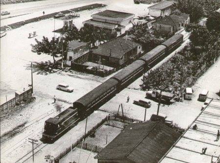 Foto Antiga Mongaguá SP: Vista da aproximação do trem à estação de Mongaguá, vindo de Santos, no início dos anos 1960. As obras à esquerda da linha são da construção da rodovia Manoel da Nóbrega.