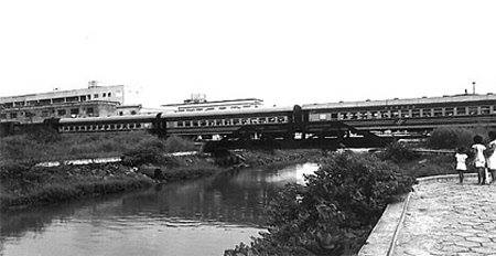 O trem da FEPASA passa por sobre a ponte em Mongaguá, em 1986, próximo à estação.