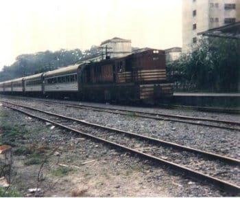 Trem de passageiros chegando em Mongaguá, em 1986. (Foto J. H. Bellorio)