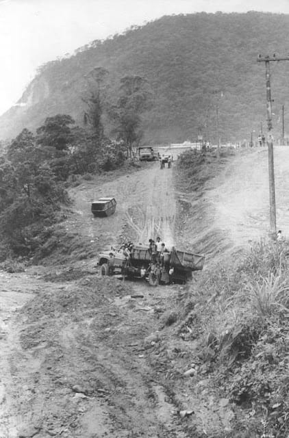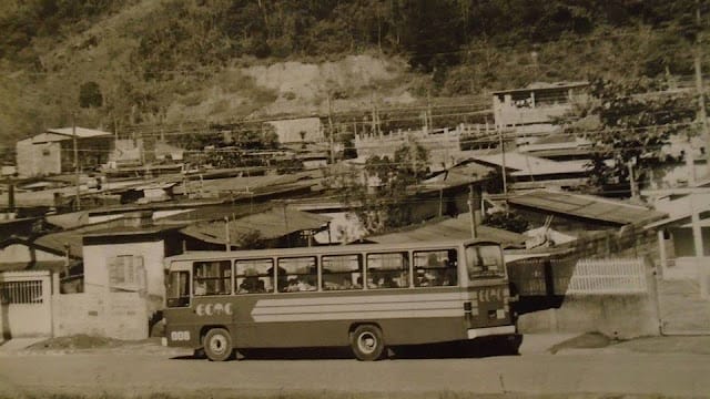 Foto Antiga Cubatão SP:  Ônibus da linha intermunicipal que ligava Cubatão à Santos seguindo viagem pela antiga estrada Bandeirantes.