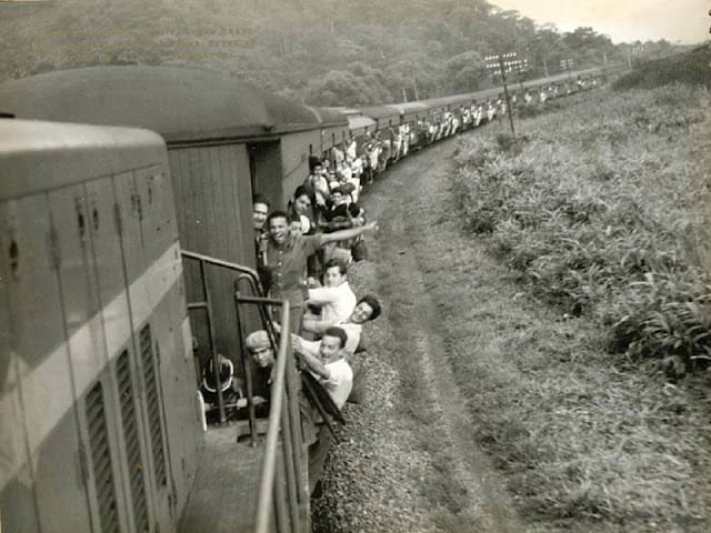 Foto Antiga Cubatão SP: Trem de operários em carros de madeira na linha entre Santos x Cubatão em 1976.