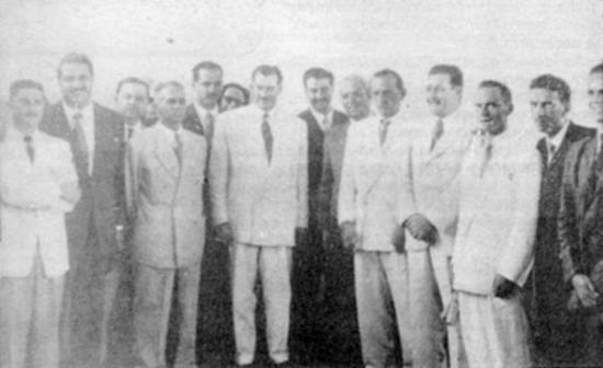 Foto Antiga Cubatão SP: Armando Cunha (ao centro). 01º e 03º Prefeito de Cubatão, de 9/4/1949 a 09-04-1953 e de 09-04-1957 a 09-04-1961. Este foi o primeiro prefeito de Cubatão. Foi reeleito para cumprir a terceira legislatura do município. Nascimento: 25 de julho de 1918 / Falecimento: 25 de dezembro de 1979.