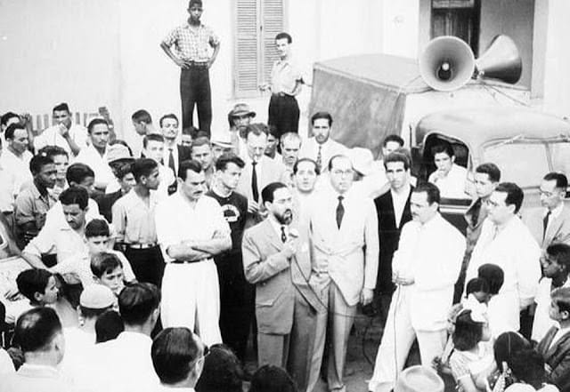 Foto Antiga Cubatão SP: Comício de Armando Cunha em 1949, que se elegeria prefeito e assumiria a cidade recém emancipada.