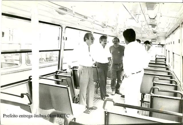 Foto Antiga Cubatão SP: Prefeito Nei Eduardo Serra acompanha entrega de ônibus 0km para a ECTC (Empresa Cubatense de Transporte Coletivo) nos anos 80.