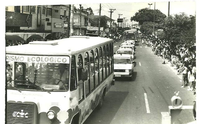 Foto Antiga Cubatão SP: Desfile cívico na Avenida 9 de Abril com apresentação de novos carros para a frota da Prefeitura Municipal de Cubatão, meados da década de 80.