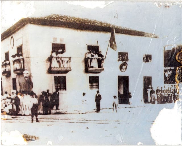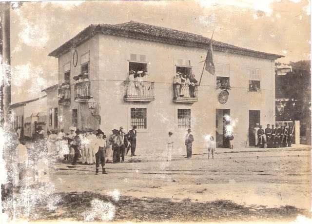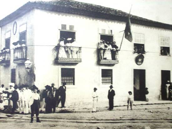 A comunicação oficial da Proclamação da República foi feita aos vicentinos de uma das sacadas do Paço Municipal pelo capitão Gregório Inocêncio de Freitas, então presidente da Câmara (Imagem: bico-de-pena de Edison Teles de Azevedo, baseado em um quadro a óleo pintado em 1903 pelo neto do capitão, o prof. Cimbelino de Freitas, residente em S. Paulo). Imagem: Vultos Vicentinos – Subsídios para a História de São Vicente, de Edison Telles de Azevedo (impresso na Empresa Gráfica Revista dos Tribunais S.A., S.Paulo/SP), S. Vicente/SP, 1972, p. 87.