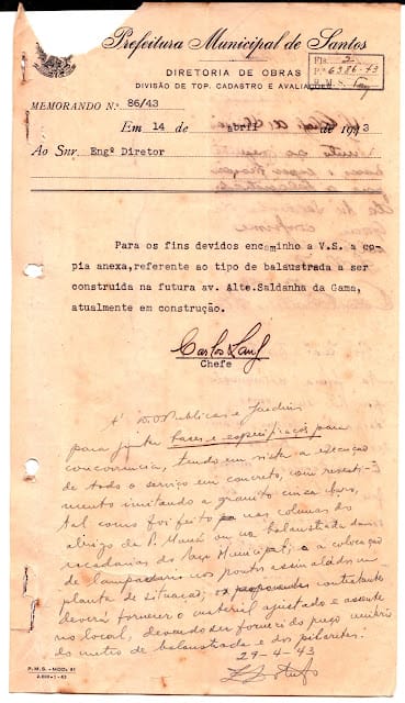 Em 1941, logo após o início das obras de criação da avenida, o então engenheiro chefe da Diretoria de Obras da Prefeitura de Santos, Carlos Lang, apresentou ao prefeito o primeiro desenho do que se chamou de “Balaustrada da Avenida Almirante Saldanha da Gama”. O elemento, além de decorativo, tinha como função proteger os traseuntes em suas passagens pelo calçamento de pedestres. O projeto contava com algumas entradas, rampas que davam acesso ao mar, especialmente construídas para uso das agremiações náuticas e polícia marítima. Após aprovada a proposta, que remetia à forte influência do “art déco”, somente em 14 de abril de 1943 é que Lang remeteu ao Departamento de Obras Públicas e Jardins o desenho esquemático para a construção das muretas, colunas e pórticos. Com o projeto, a Prefeitura abriu concorrência pública para a execução da obra, vencida pela empresa O. Ribeiro e Cia., ao preço de CR$ 379.024,00 (o que equivaleria hoje a cerca de R$ 3 milhões).