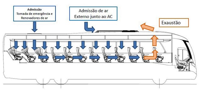 A norma ABNT 15570 para a renovação de ar para ônibus exige que os mesmos possuam uma taxa de renovação de pelo menos 20 vezes o volume interno útil do veículo (desconsiderando poltronas e demais componentes internos). Conforme explica o professor Dr. Alexandre Vieceli, coordenador do curso de Engenharia Mecânica da UCS, foram realizadas medições experimentais das vazões dos dispositivos de renovação presentes nas carrocerias de ônibus Marcopolo para quantificar o volume médio de ar externo admitido em cada tipo de carroceria. A equipe técnica concluiu que os modelos da marca apresentaram vazões equivalentes ou superiores aos ambientes especificados em norma (conforme tabela anexo).