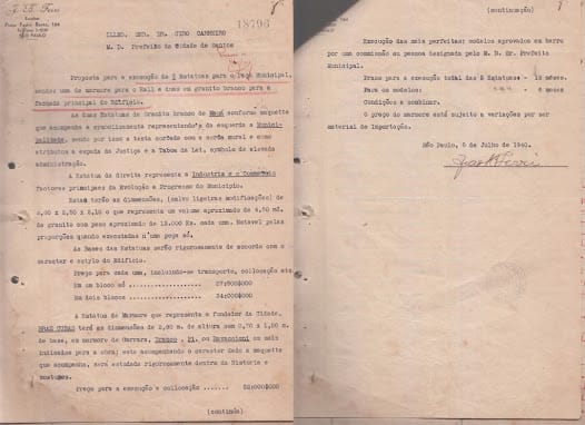 O prefeito gostou da proposta e mandou reservar os recursos para a contratação de Ferri, assim como, também, para a compra do material de produção. Segundo a proposta, as estátuas teriam as medidas de 0,80 x 2,50 x 2,10 metros, o que representaria um volume aproximado de 4,50 m³, de granito com peso aproximado de 12 mil quilos, cada um. O preço pelos monumentos era de 37:500$000 (Trinta e sete contos e quinhentos mil réis), para cada um, o equivalente hoje a cerca de R$ 370 mil (R$ 740 mil no total). O valor incluía a matéria-prima, o transporte e a colocação, só não incluindo a base, feita de granito “a picola fina”, que deveriam seguir “rigorosamente o caráter e estilo do edifício”. O custo da base foi de 5:700$000 (Cinco contos e setecentos mil réis), o equivalente a R$ 57 mil reais.