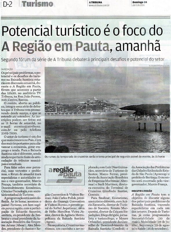 Jornal A Tribuna: Potencial Turístico da Baixada Santista é tema de Evento