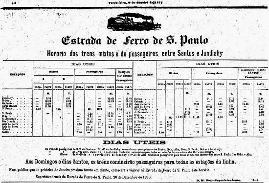 Estrada de Ferro de S. Paulo (S. Paulo Railway) – horários dos trens entre Santos e Jundiaí