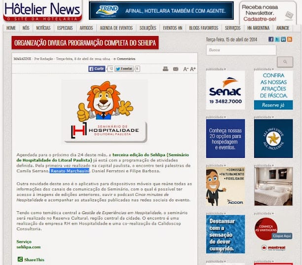 Renato Marchesini é Palestrante no Sehlipa 2014 – São Paulo SP (Matéria Hôtelier News)
