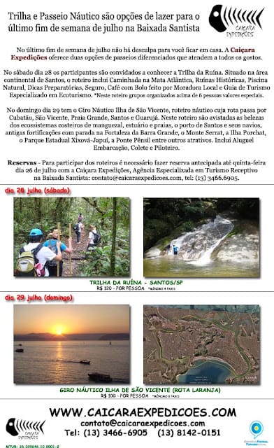 Trilha e Passeio Náutico são opções de lazer para o último fim de semana de julho da Baixada Santista