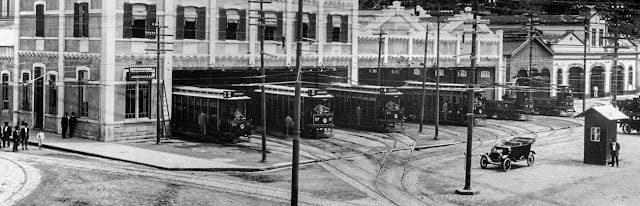 Em 1930, os bondes já circulavam pela Ponta da Praia Santos /SP