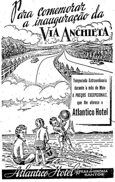 Anúncio Antigo: Inauguração da Via Anchieta no anúncio do Atlântico Hotel, na praia do Gonzaga, em Santos SP