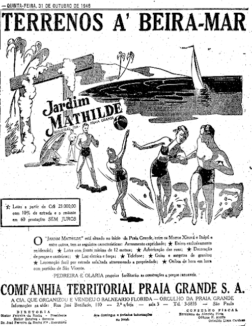 Anúncio Antigo Terrenos a Beira Mar: Jardim Mathilde em Praia Grande em 1946