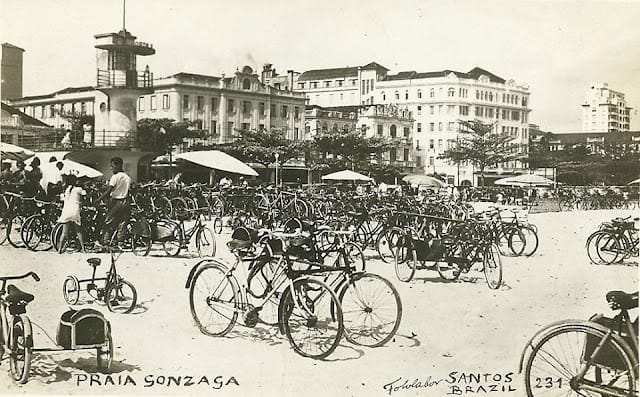 Cartão Postal Antigo Santos SP: Praia do Gonzaga e Aluguel de Bicicletas (anos 1940).