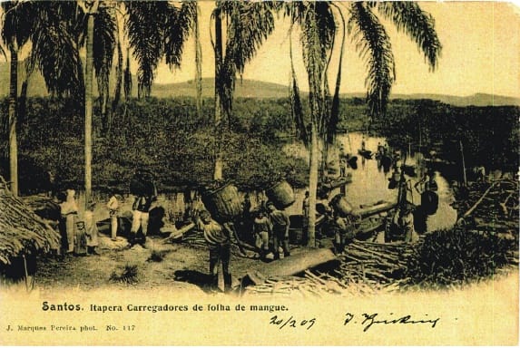 FOTOS ANTIGAS SANTOS: Itapera, homens carregando cestas de folhas de mangue.
