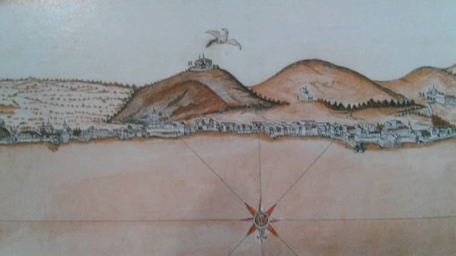 Vila de Santos no século XVIII. No segundo plano vemos a Capela do Monte Serrat.