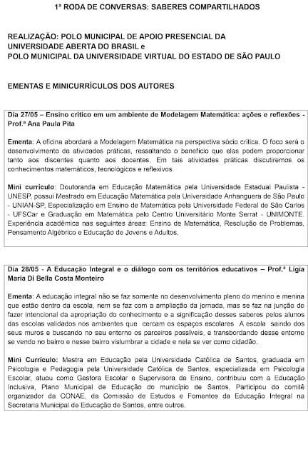 EVENTO: Polo Santos UAB/UNIVESP – 1ª RODA RODA DE CONVERSAS: SABERES COMPARTILHADOS. Com Renato Marchesini